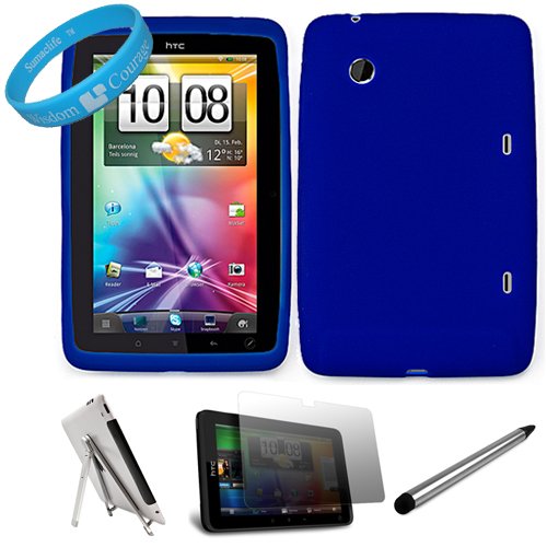 Buy Now! Blue Premium Soft Silicone Skin Cover for HTC Flyer Tablet also compatible with Sprint HTC EVO View 4G Android Tablet + Scratch Guard Clear Screen Protector + Dual Tip Soft Touch Stylus Pen + Silver Metal Stand for HTC Flyer + SumacLife TM Wisdom*Courage Wristband